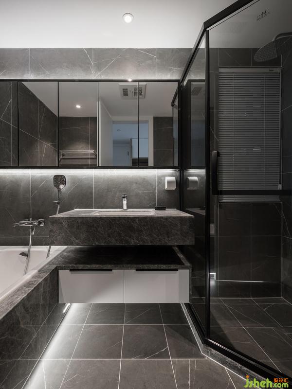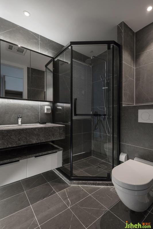 采用灰色大理石紋瓷磚,配上恰到好處的燈源,增加空間的高級(jí)感。浴室柜采用鏡面的設(shè)計(jì),淋浴房推拉門的運(yùn)用也節(jié)省了不少空間。