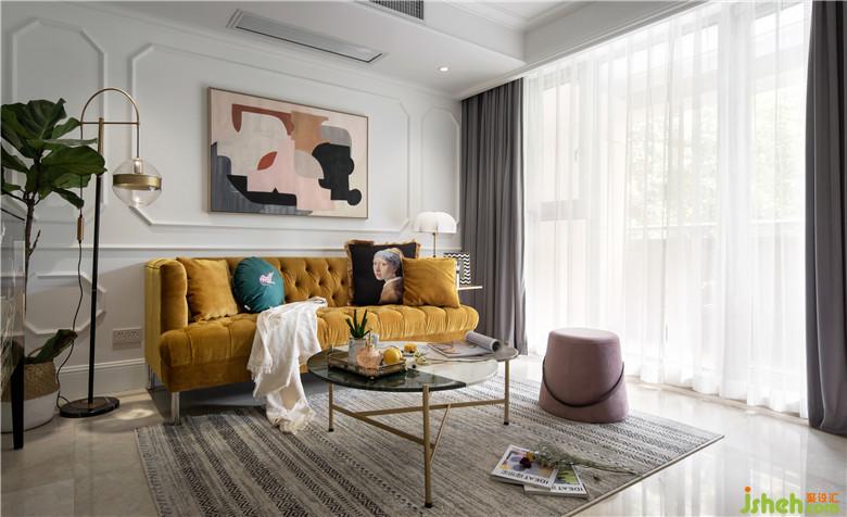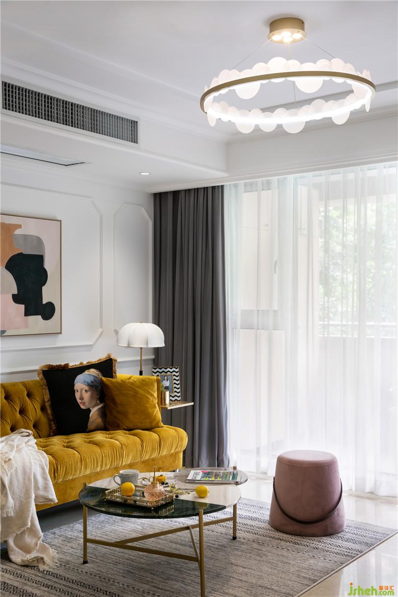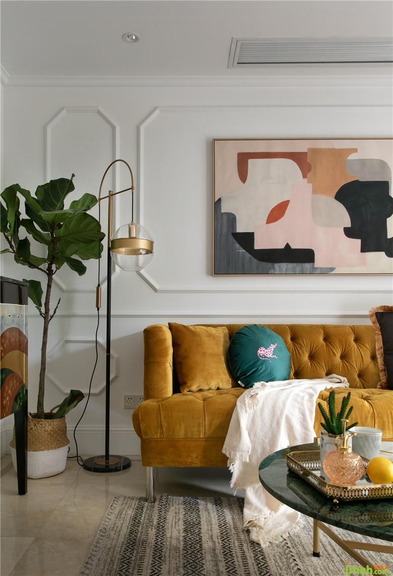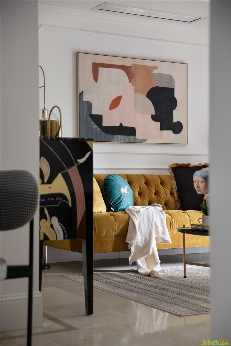 將墻面的墻紙和電視背景墻進行拆除,墻面批膩子后做了線條做裝飾。軟裝搭配上,亮黃色沙發(fā)是整個空間視覺的焦點,裝飾畫與沙發(fā)邊柜風格相呼應,充滿了摩登與藝術感。