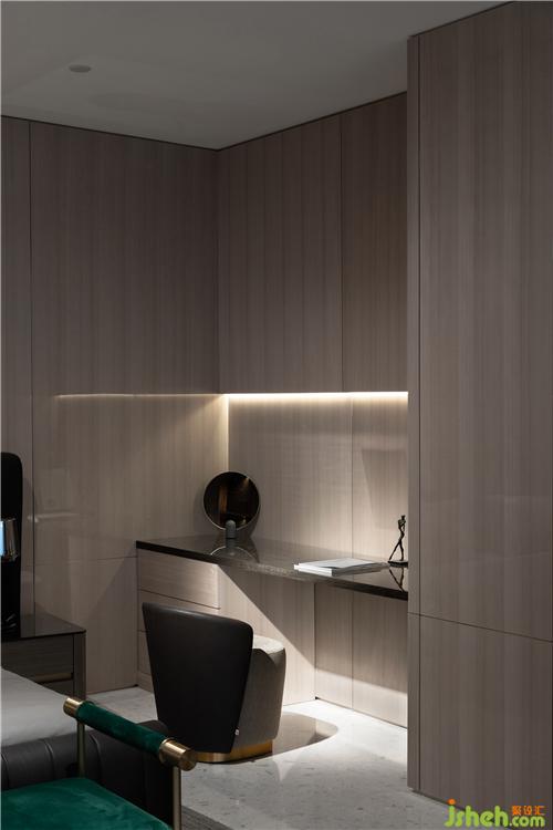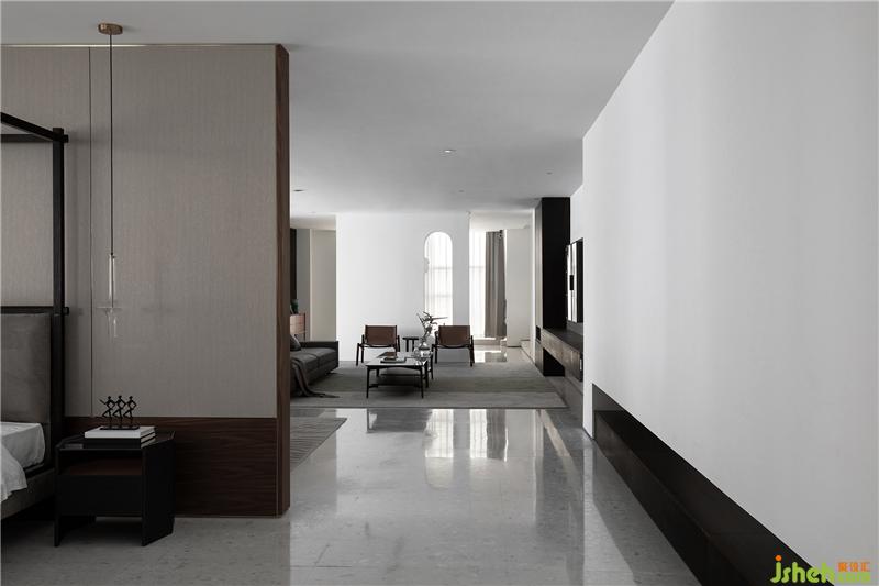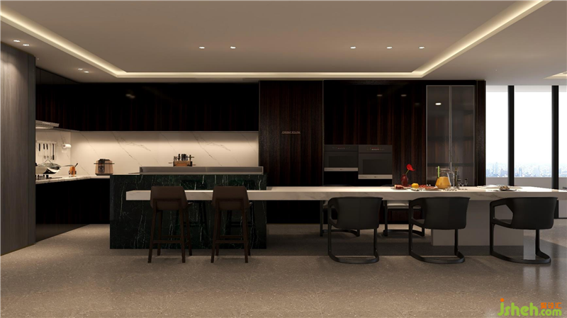 最后是餐廚會(huì)客廳,醒目的紅色壁畫,低調(diào)奢華的黑色櫥柜,無(wú)主燈設(shè)計(jì)。利用墻體和材質(zhì)之間落差,來(lái)進(jìn)一步強(qiáng)調(diào)空間的視覺縱深感和層級(jí)遞進(jìn)關(guān)系。會(huì)所設(shè)計(jì)