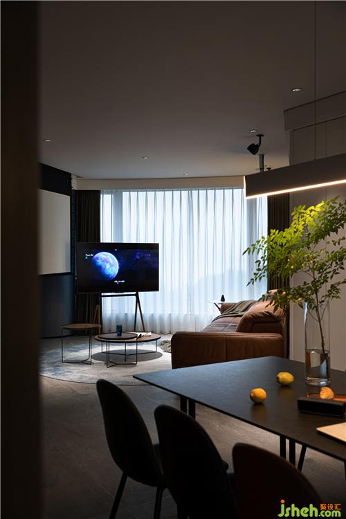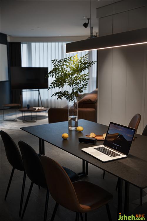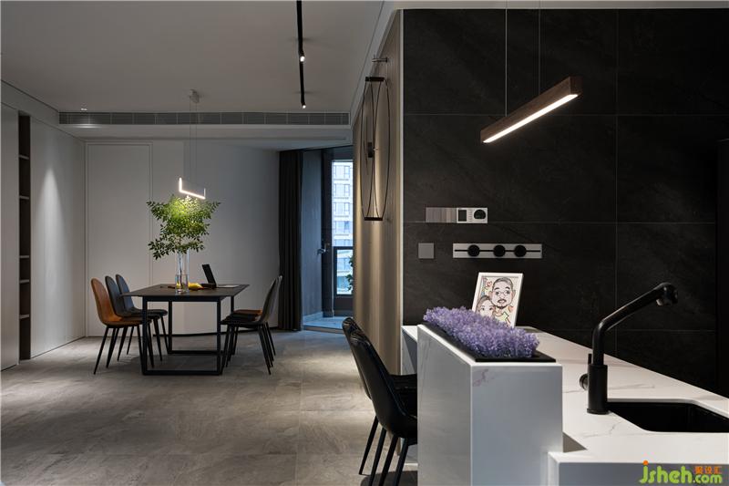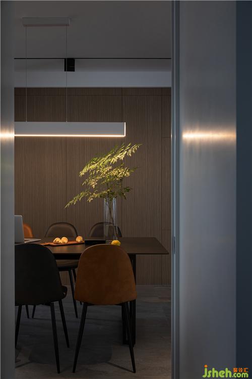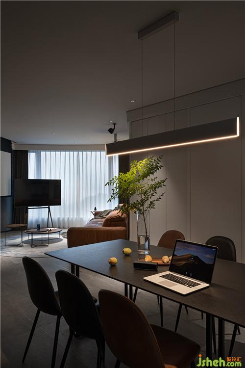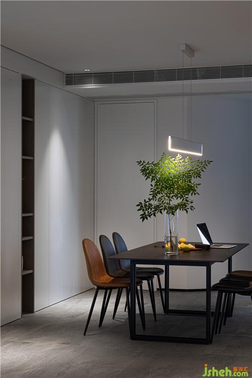 開放式的客餐廳拓寬了視野,將空間尺度拉升到極致,利用每一個角落,搭配白色長吊燈,杭州裝修設計讓視線由遠及近,借助客廳的光,形成補光效果。