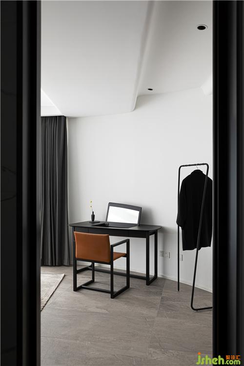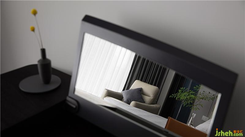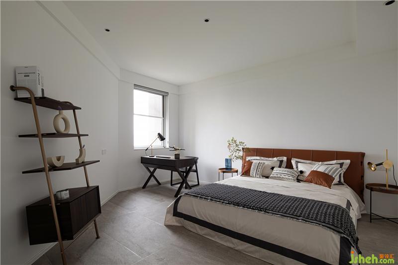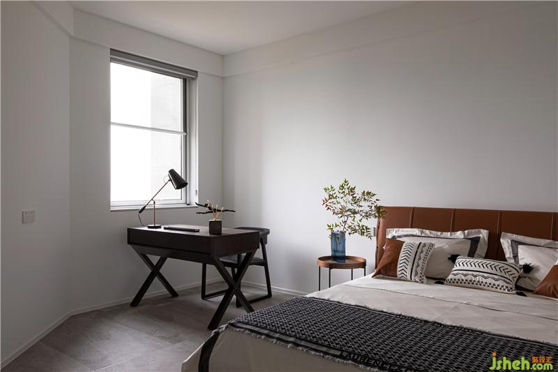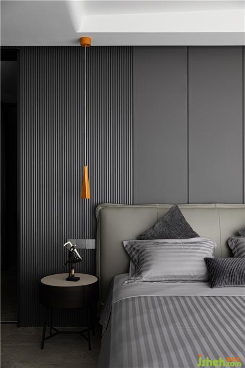 主臥延續(xù)了深灰色的基調(diào),床靠背景墻采用灰色波浪飾面板,杭州裝修設(shè)計(jì)整個空間沉穩(wěn)。