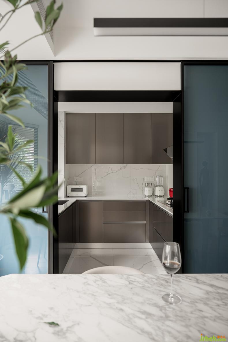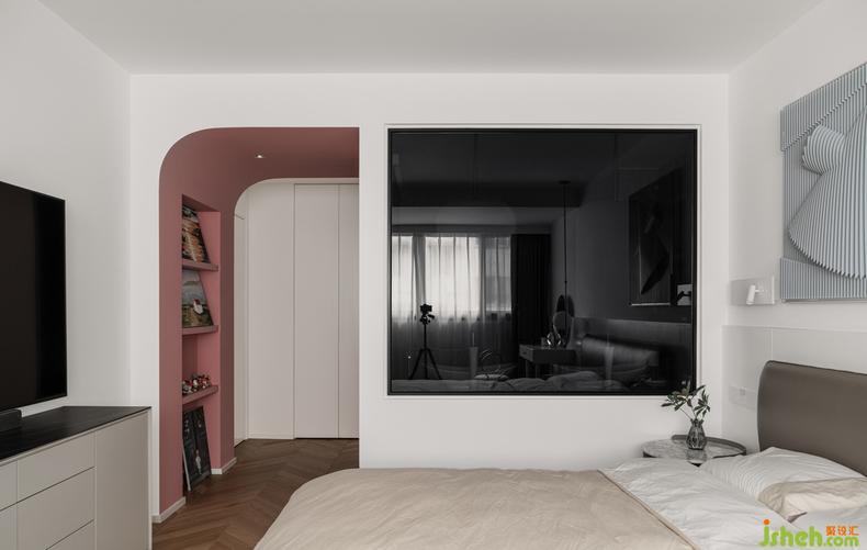 臥室往往不僅是主人休憩的地方,也是儲物的空間,裝修設(shè)計(jì)在床的左邊設(shè)計(jì)一處玻璃大窗作為主衛(wèi)的光線來源。