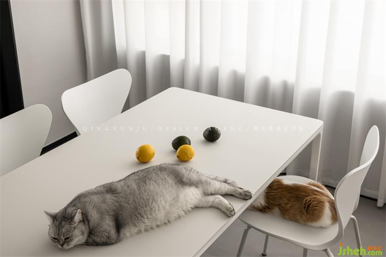 When the sliding door of the entertainment area is opened, the dining room and the leisure area are integrated, and two people and three cats can play to their heart's content; when the sliding door is closed, it becomes a private master bedroom large suite.