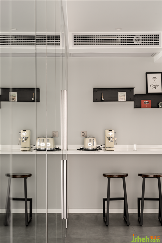 吧臺:水吧臺是放置一些咖啡機和面包機等小電器,墻面錯層的置物架,可以滿足隨手拿取水杯及物品。