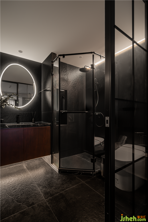 衛(wèi)生間:采用黑色地磚+玻璃,工業(yè)與現(xiàn)代的碰撞,搭配整條燈帶,高級感和氛圍感同時拉滿。