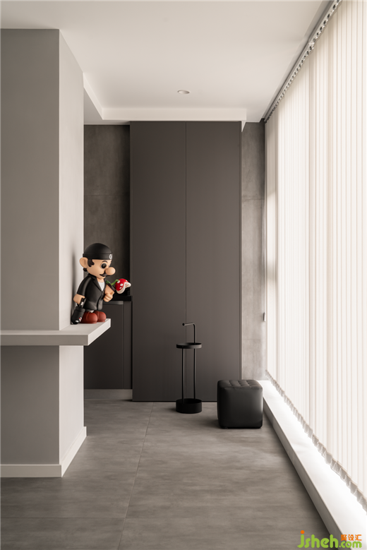 過道:地面運用的是微水泥地磚,深灰色置頂柜與落地窗形成自然的光影效果。