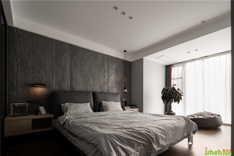 臥室:床頭背景墻采用的是水泥板,色調(diào)相對較深,搭配原木地板,與定制的家具,素雅低調(diào),打造出靜謐的效果,讓主人回到一個舒適的休憩空間。