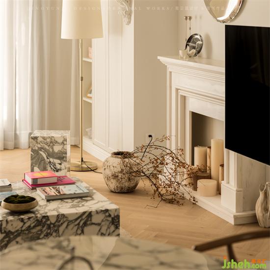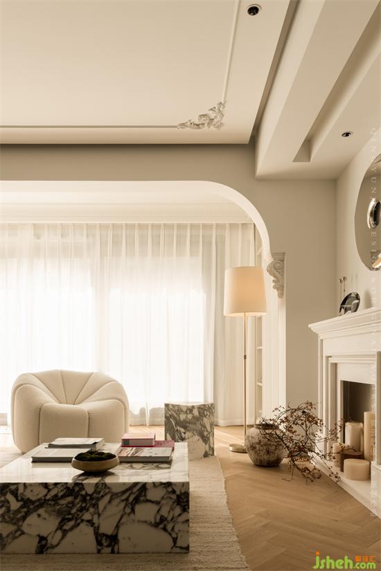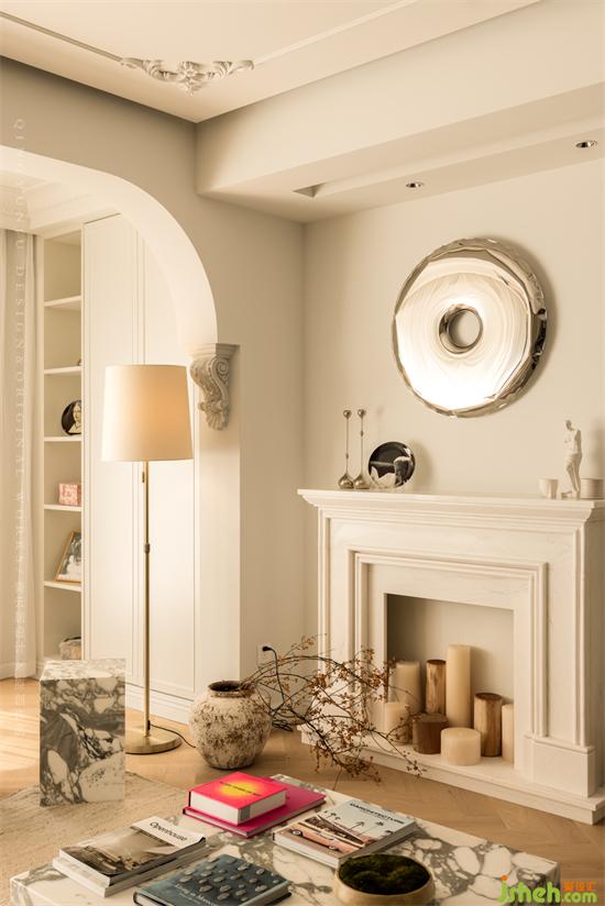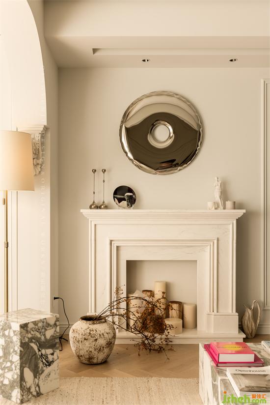 杭州錦麟府裝修設計獨特的雕花造型+弧形元素,體現(xiàn)出經(jīng)典的法式風,裝飾壁爐+圓形金屬裝飾品,將現(xiàn)代元素恰到好處地融入法式風。