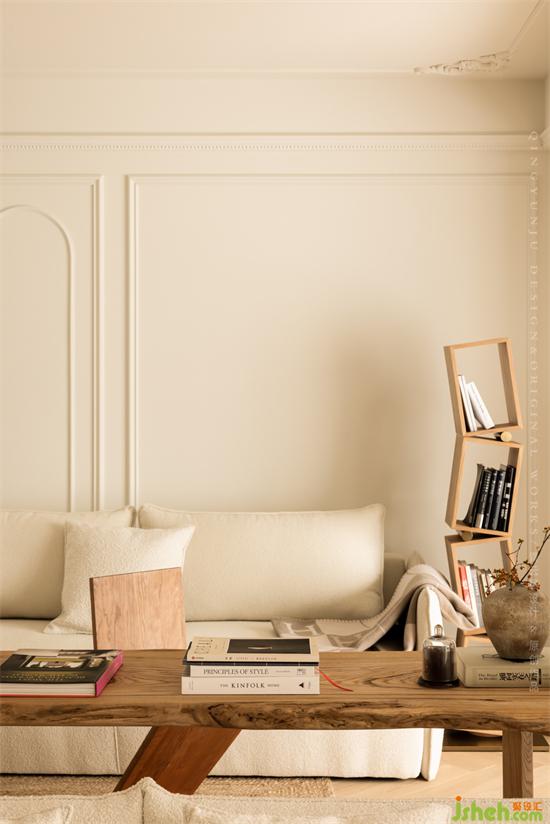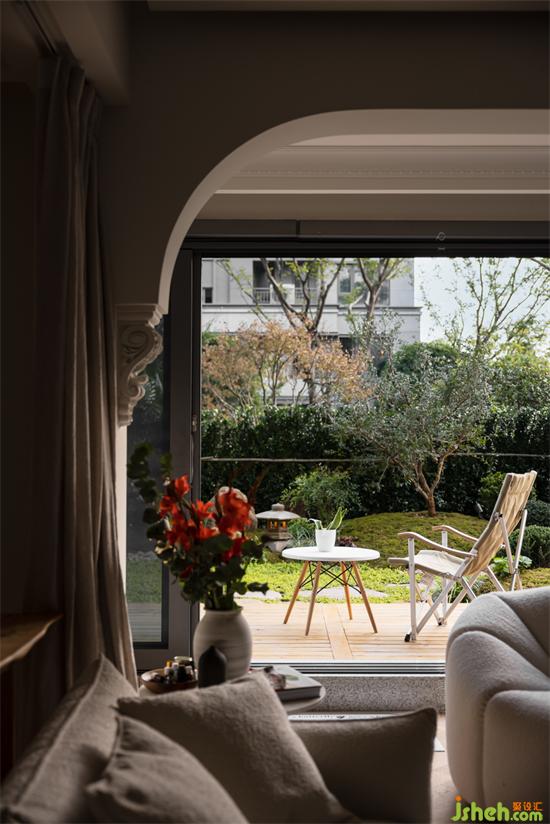 絨布沙發(fā)+實木桌椅,造型樸實大方、線條飽滿流暢,沒有經(jīng)過人工刻意地修剪,留存著自然的美感。