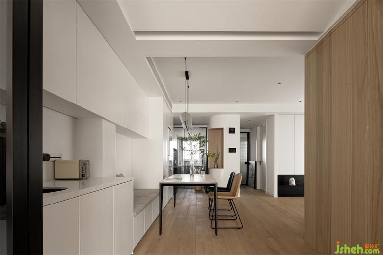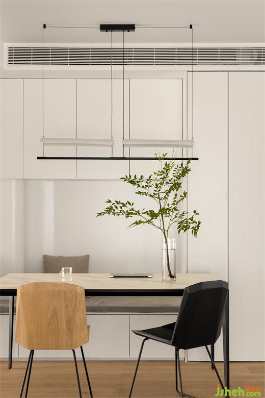 餐廳的另外一邊設(shè)計(jì)的是一體柜式座椅,優(yōu)化了餐廳的空間,杭州世貿(mào)之西湖家裝設(shè)計(jì)整體設(shè)計(jì)空間更加融合。