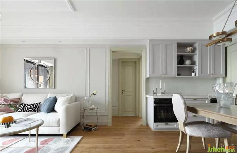 經(jīng)由我們軟裝改造后的客廳是一個(gè)充滿幾何美的小天地,優(yōu)雅素凈之中,又不失活潑生趣,壁上的圓形造型鏡與垂懸的吊燈、簡(jiǎn)約茶幾以及地毯相互呼應(yīng)著,墻面造型為空間增添了雅致感。