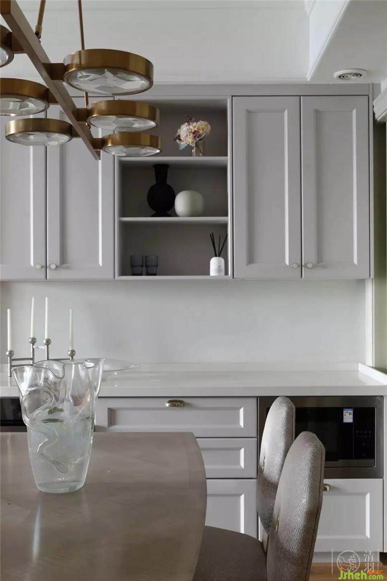 餐廳空間原本顏色簡(jiǎn)淡,我們?cè)谠A(chǔ)上添置了現(xiàn)代而富有光澤的吊燈以及餐桌椅,用恰當(dāng)好處的設(shè)計(jì)筆法,給空間帶來(lái)了優(yōu)雅的魅力與高級(jí)之感。