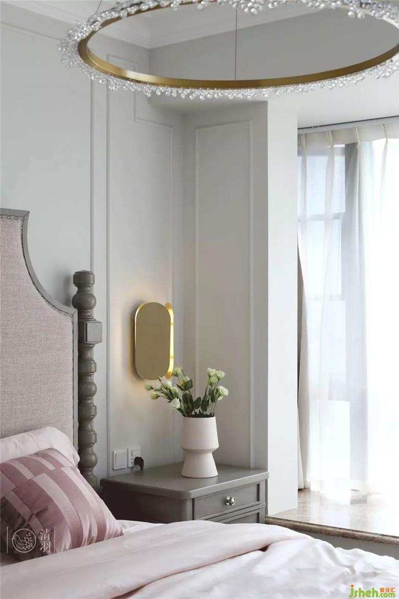 自古紅藍(lán)出cp,這里清爽的藍(lán)與粉嫩的紅呼應(yīng)了客廳的設(shè)計(jì),搭配上精美的吊燈和大氣的床頭營(yíng)造出了浪漫感和如玉一般溫和柔潤(rùn)的視覺(jué)觀感,妥妥地滿足女主人的少女心。