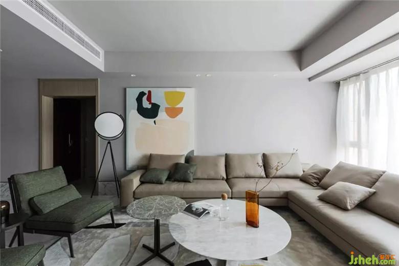 客廳的布局自由而放松,硬裝是追求質(zhì)感和極簡(jiǎn)的狀態(tài),家具是CAMERICH 銳馳的全套家具,深草綠的沙發(fā)椅、深卡其的皮質(zhì)沙發(fā)、淺灰的墻面、珞黃的透明花瓶,配合大理石的自然紋理、木材的天然質(zhì)感,整個(gè)客廳都散發(fā)著溫暖且極具包容感的味道。