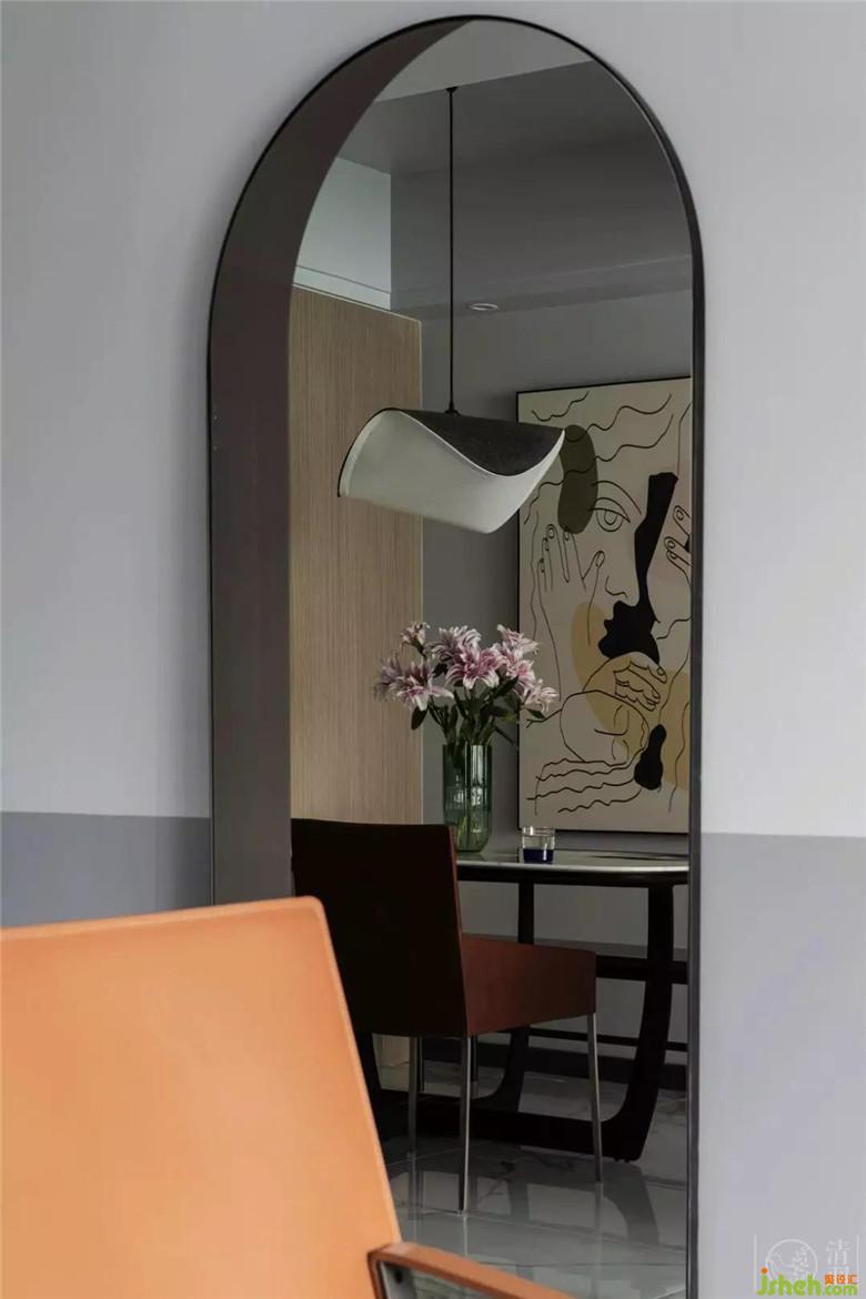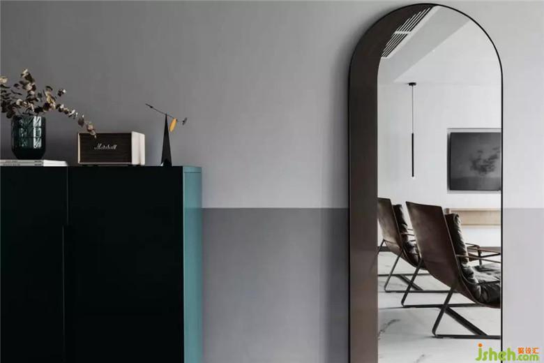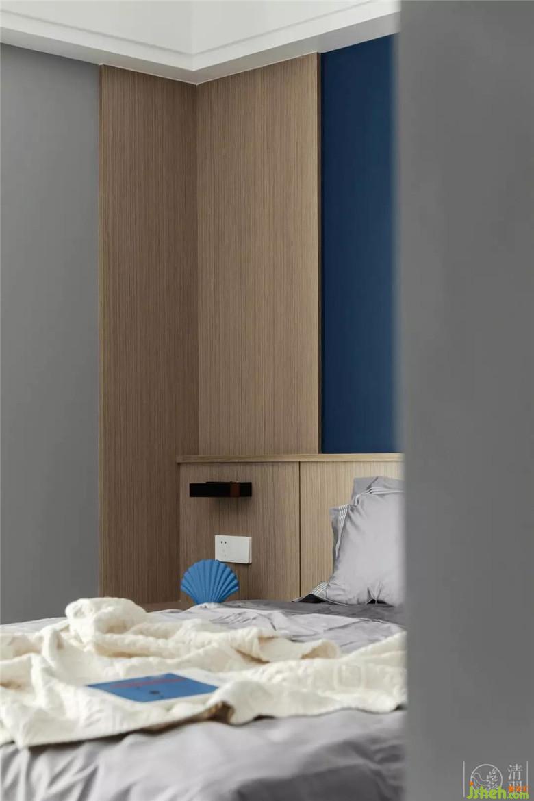 一個不大但很精致的空間,并非采用傳統(tǒng)的設(shè)計(jì)手法,而將床頭柜、床頭板與墻面合并,節(jié)省了空間的面積,為主人的日常增加了活動范圍。大面積沉靜的灰與藍(lán),幫助人漸漸地進(jìn)入入眠的氛圍和心境。
