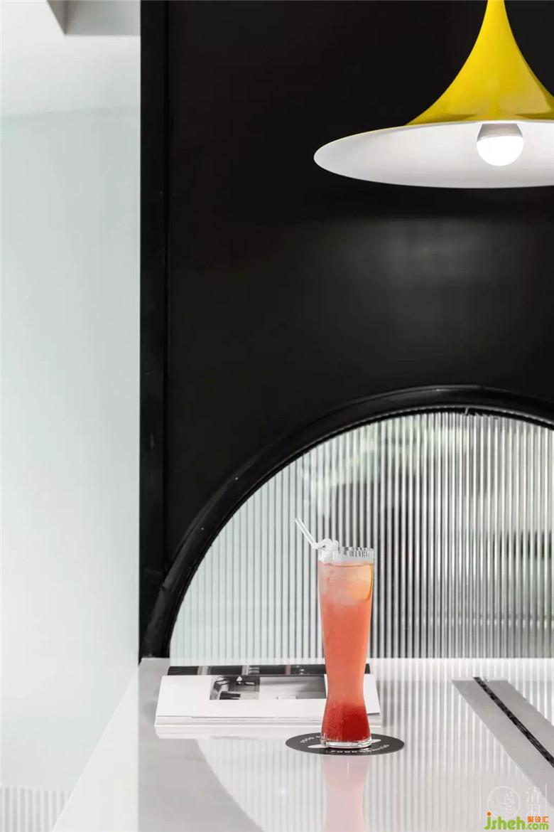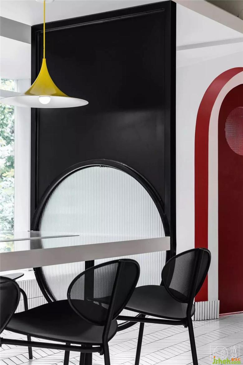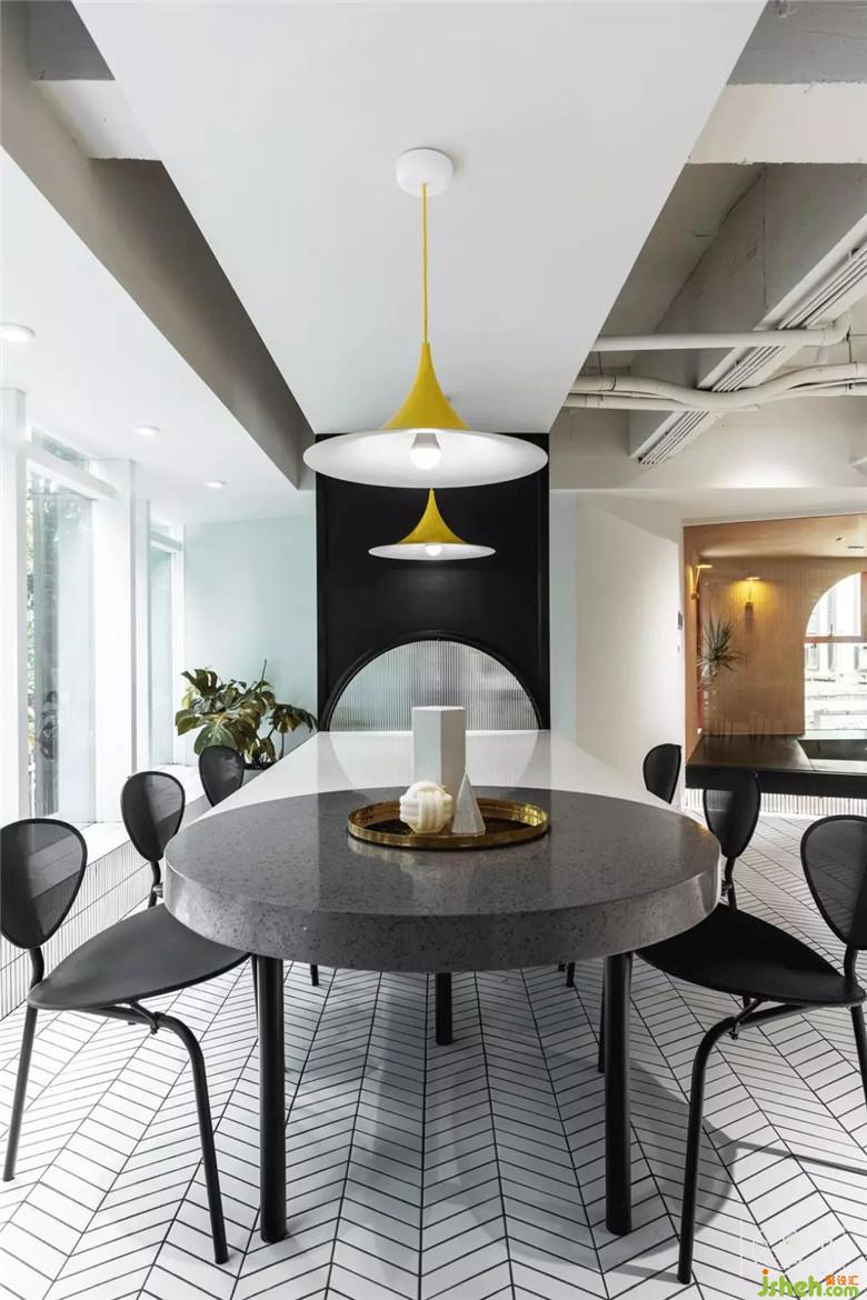 當(dāng)然,餐飲店不得不考慮的就是多人聚餐,因此一張與空間整體風(fēng)格相得益彰的大桌子是必備。稍大面積的灰白拼色石材桌面,不會顯得突兀,在某種角度也給人一種行星墜落既視感,不失趣味。