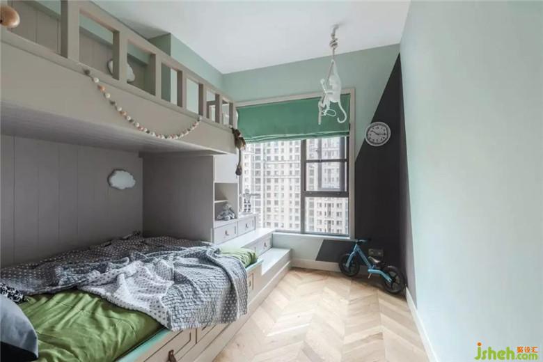 兒童房現(xiàn)在的小主人是個活潑可愛的小男生,因此乳膠漆的顏色我們用了低保和度淺綠色、輔以同色系、飽和度稍高一點的窗簾,搭配白色的床體、原木色的魚骨拼地板。清爽有活力,也輕松的成長空間躍然呈現(xiàn)!