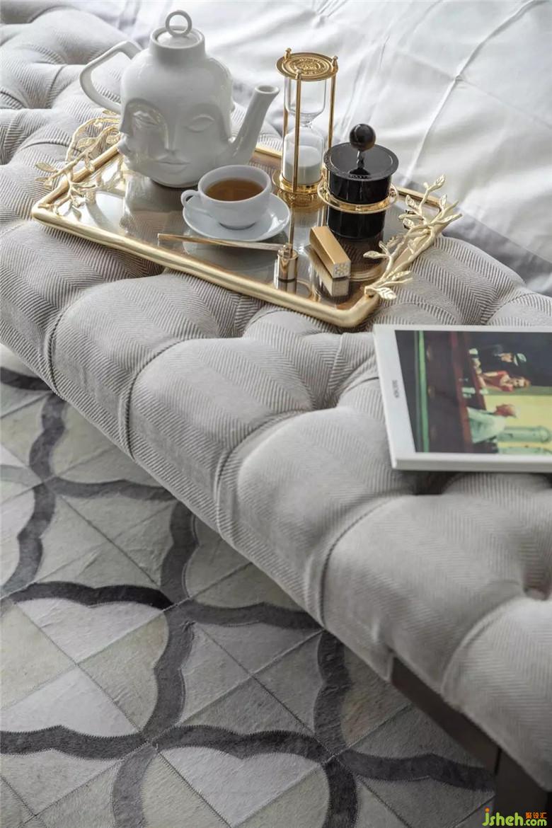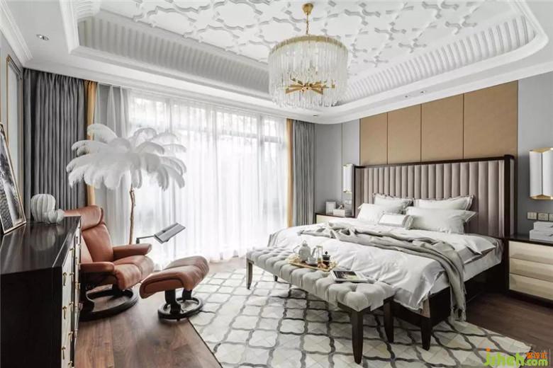 臥室,是相對(duì)容易打造出高級(jí)感的空間。它更私密,卻也更能體現(xiàn)屋主的品味。我們定制了灰杏色的鴕鳥皮搭配黑色木頭包邊的床頭板,干凈簡(jiǎn)單的豎線條呼應(yīng)背景墻的走線,就是安靜、克制的休息空間了。窗邊的羽毛燈和挪威進(jìn)口的斯特萊斯皮質(zhì)休閑椅,又剛剛好的溫柔了一室的理性。