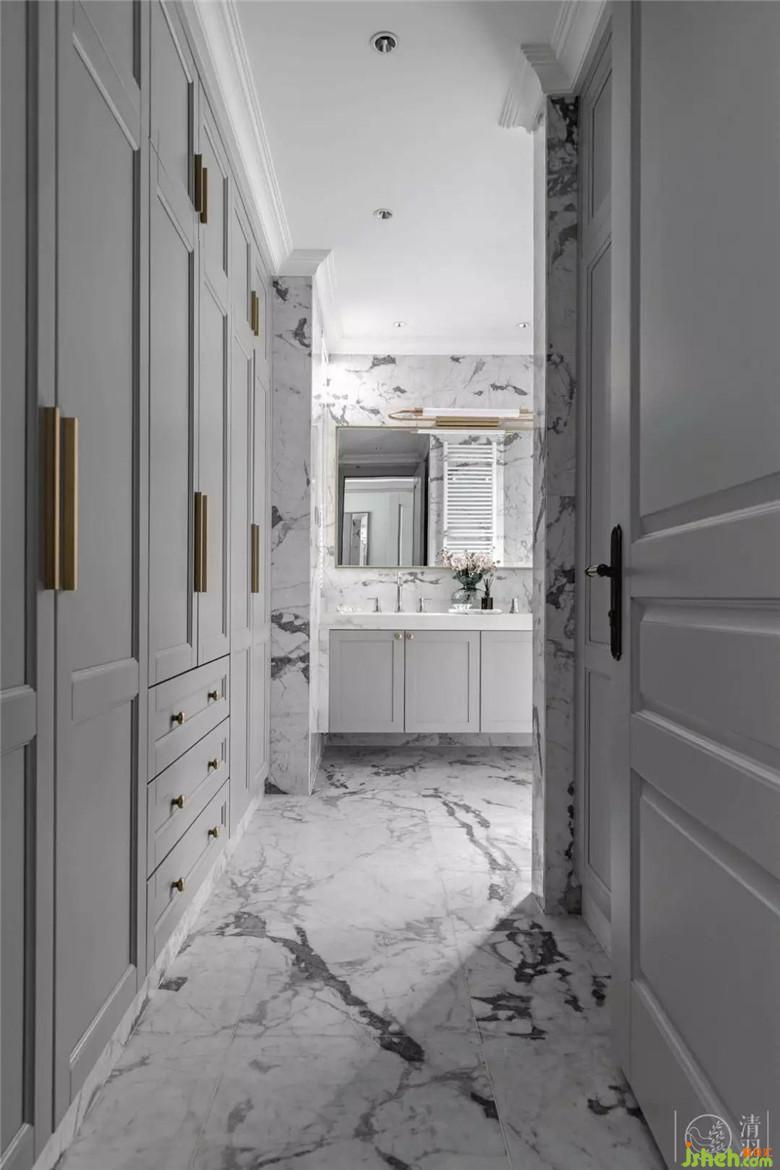衛(wèi)生間,是必備空間,但它不用太奪目。它依然是淺色系大理石墻面、灰藍(lán)色的柜體加金色配件的整體搭配,你可以認(rèn)為它是在強(qiáng)化整體設(shè)計(jì)的高級(jí)感,也可以認(rèn)為,這個(gè)搭配本身就是這間屋子將要流傳的“經(jīng)典”。