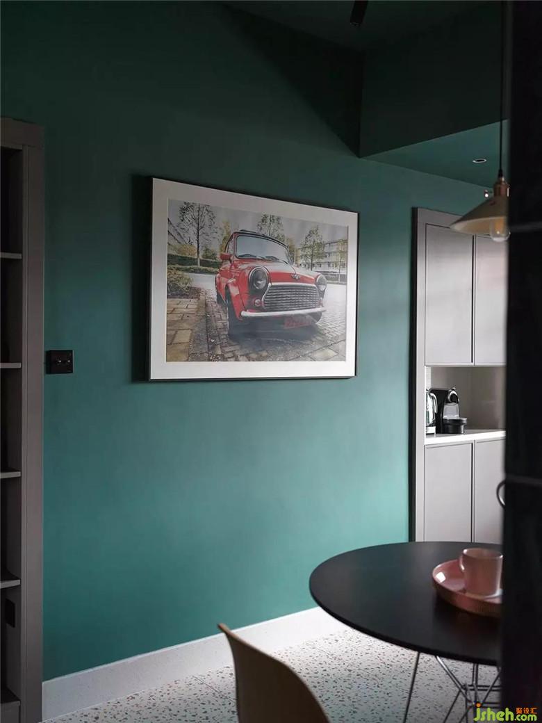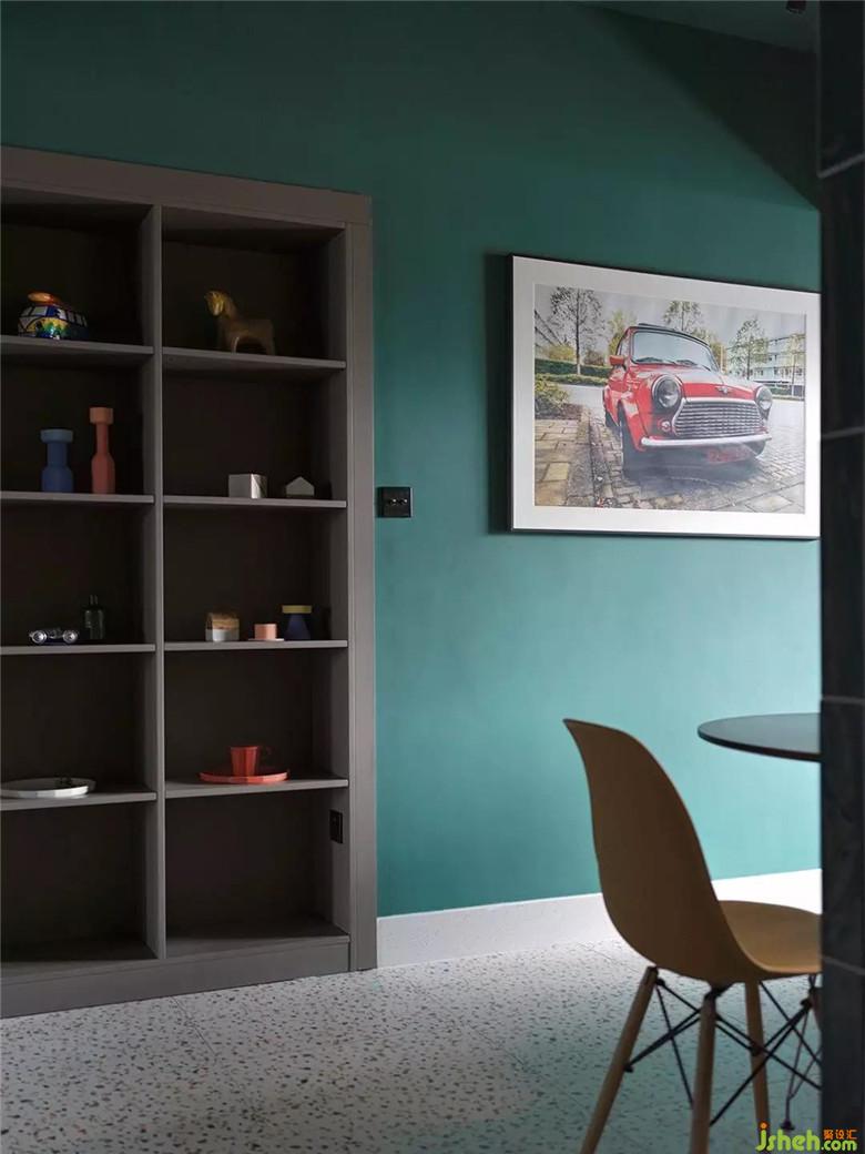 規(guī)劃好整個空間結構以后,我們對墻面進行了美化:在新建墻體時,盡量預留窗洞,然后用玻璃和幾何圖案組合為隔斷;用灰彩色乳膠漆分色出幾何圖案豐富視覺;在顏色的分配上,我們采取了局部重色局部留白的方式,留白部分的墻面會作為投影儀幕布功能使用。