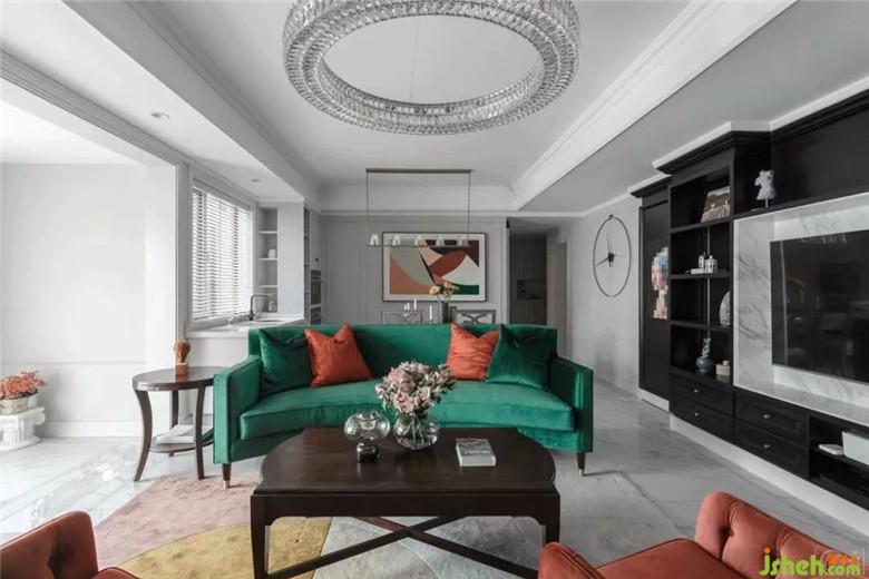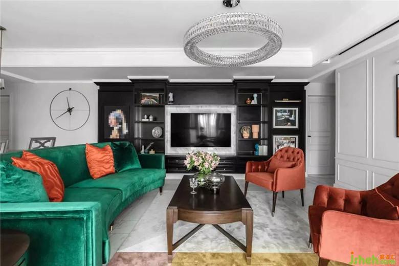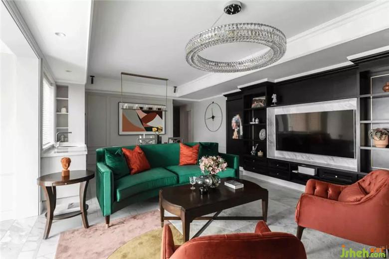 整個空間的配色都是經(jīng)過了精心的搭配:沙發(fā)、窗簾、抱枕、定制油畫,墨綠色、黑色和橘色貫穿在整個客廳餐廳區(qū)域。