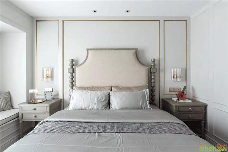 整個(gè)主臥室素雅安靜,局部使用了護(hù)墻板加金屬線條,增加空間的精致感。