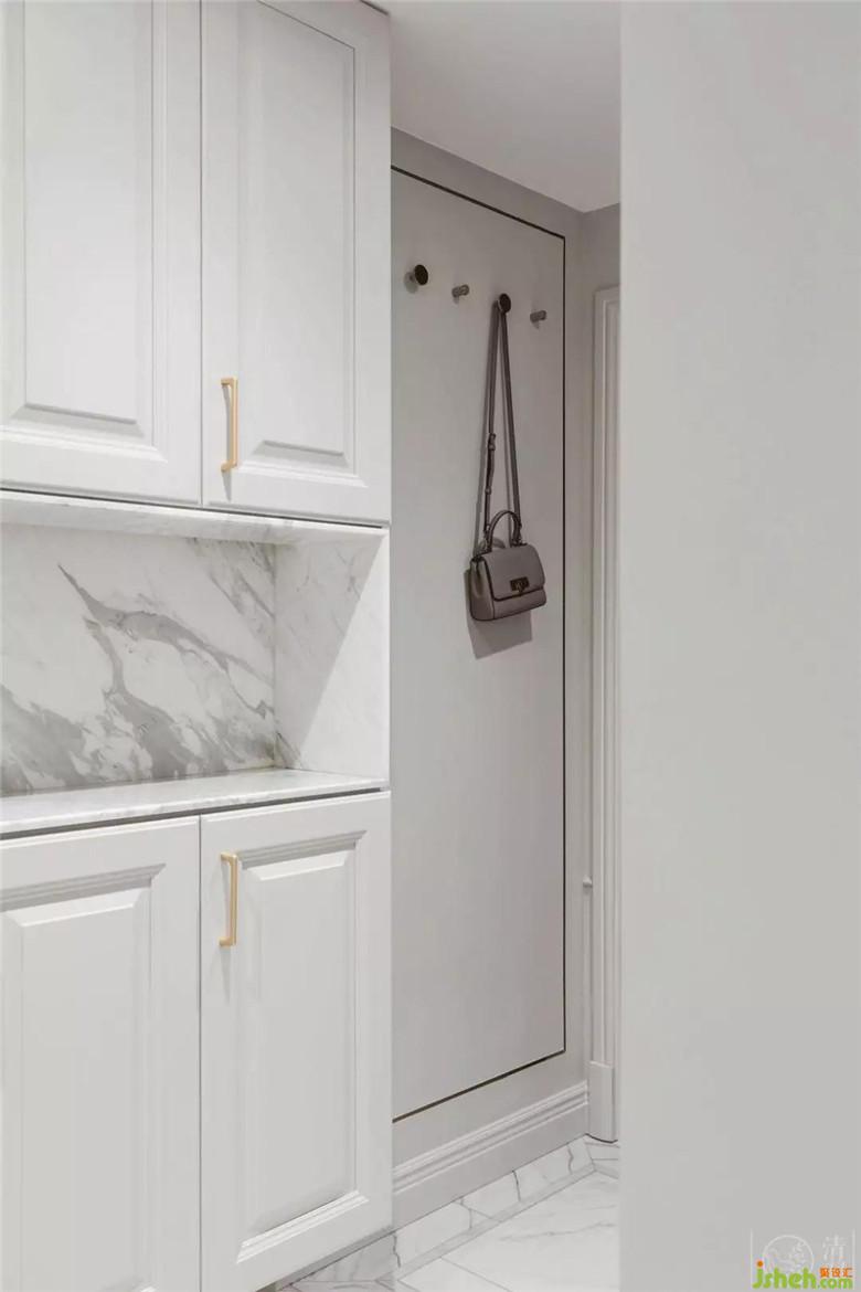 入戶在擁有超強收納鞋柜的同時,和電視墻一樣都植入了石材盒子作為分割,讓普通的鞋柜不僅僅只擁有收納的功能,還承載了更多展示的作用。