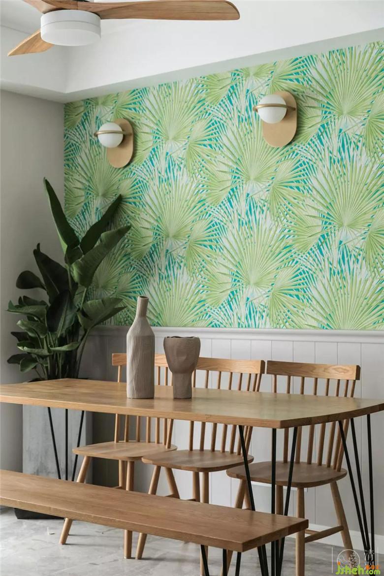 植物背景的墻紙和原木色的餐桌椅、風(fēng)扇燈讓餐廳的氛圍輕松愉悅。