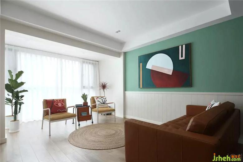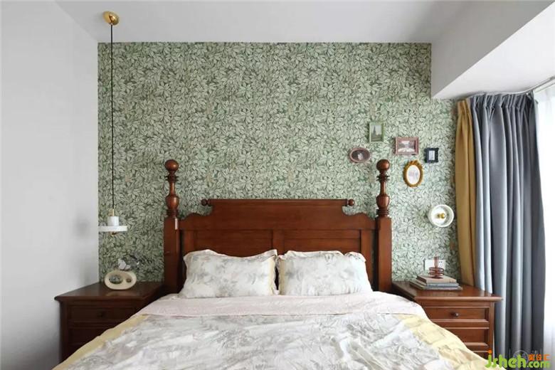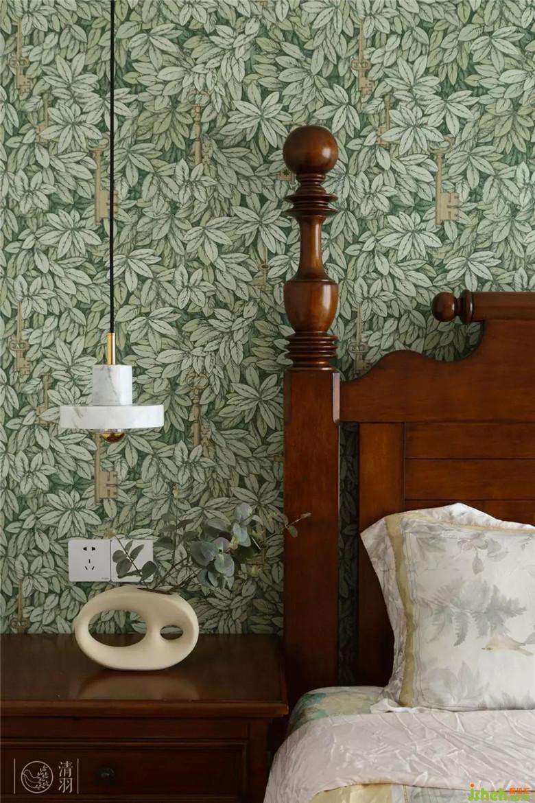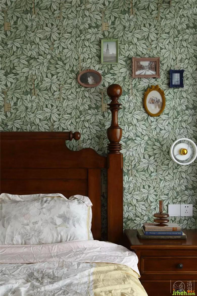 油畫質(zhì)感的植物系綠色墻紙,點(diǎn)綴上形狀各異的小相框,襯托著棕褐色的復(fù)古造型雙人床,讓臥室透出一股濃濃的美式復(fù)古感。