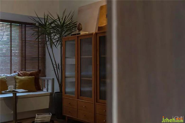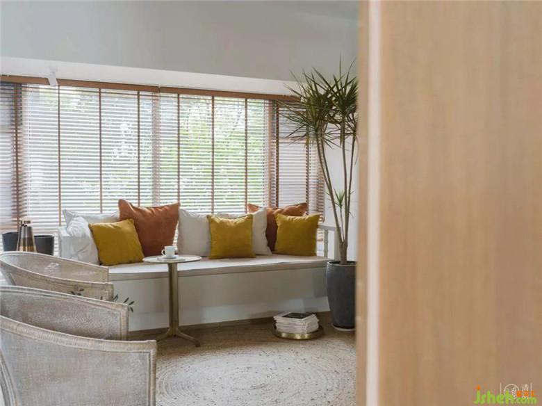 豎廳改橫廳!打破它3.3米的常規(guī)布局,拓寬客廳開間至4.4米!以最大限度利用空間同時降低空間飽和程度為目的,飄窗干脆改“沙發(fā)”!電視墻太雞肋,摒棄!僅用木質(zhì)百葉窗代替厚重的布藝窗簾,在保障隱私的前提下,給自然光極大地尊重,并以此呼應(yīng)草編的地毯與蒲團(tuán)。茶幾,太阻礙情感交流,也去掉,給圖圖寶貝更大的活動空間也能接納更多的親朋好友!
