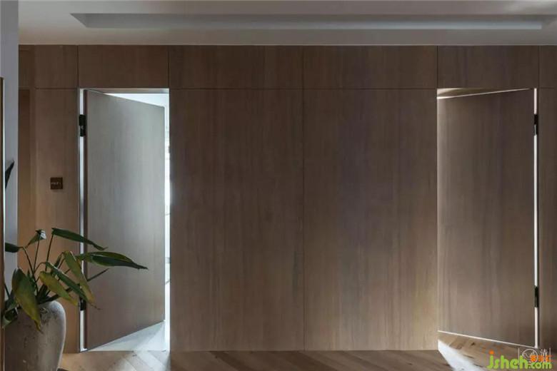 我們以到頂?shù)脑旧b飾面板上墻,巧妙地將次衛(wèi)與通向陽臺房間的墻面做成隱形墻,關(guān)上門即刻化身超大投影幕布背景墻。