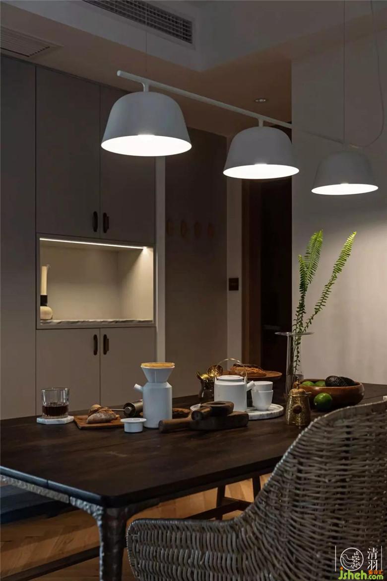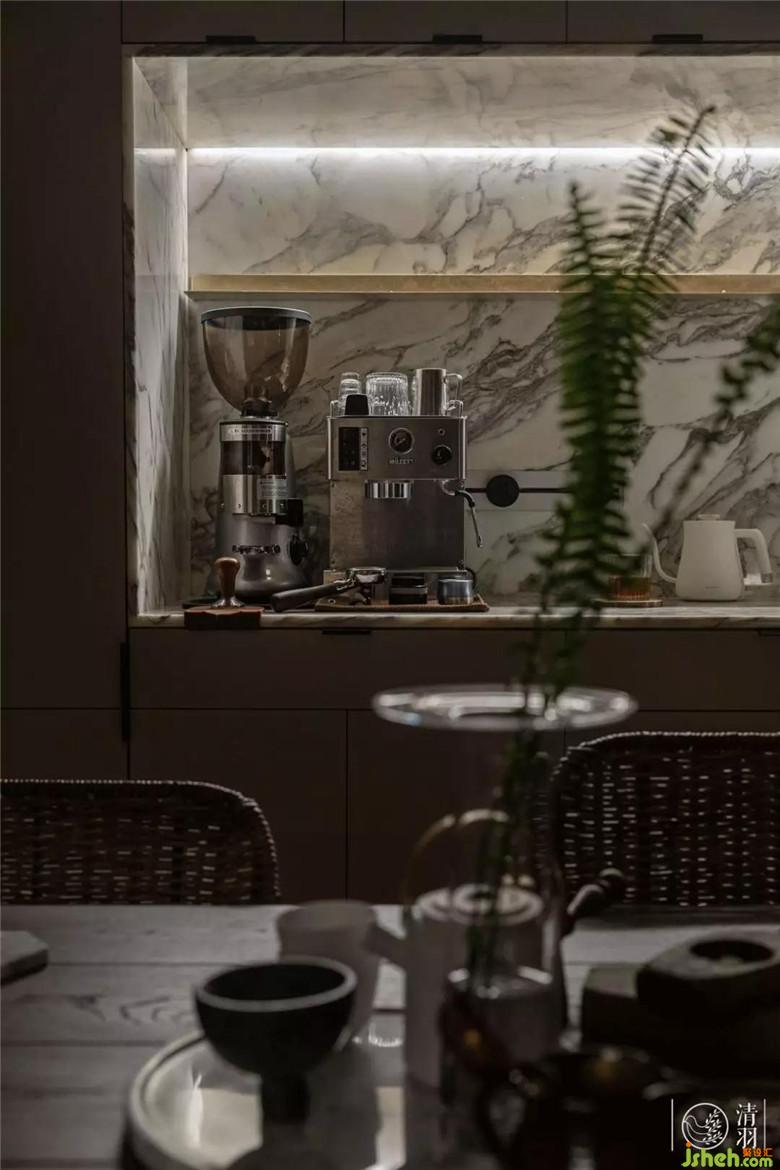 餐桌背后與廚房銜接的墻面,切割出一個嵌入式料理臺,前衛(wèi)而實用。放置上常用的咖啡機(jī)、手沖壺,方便日常使用的同時也再次強(qiáng)調(diào)了整個空間的“輕松休閑”感。