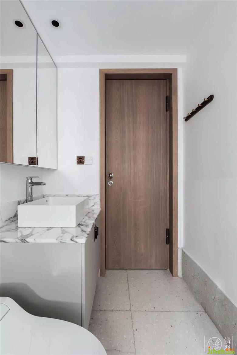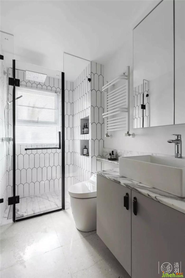 衛(wèi)生間均以大面積白色搭配特殊造型白墻磚及灰白色石材紋理瓷磚打造出清爽潔凈的空間氛圍。
