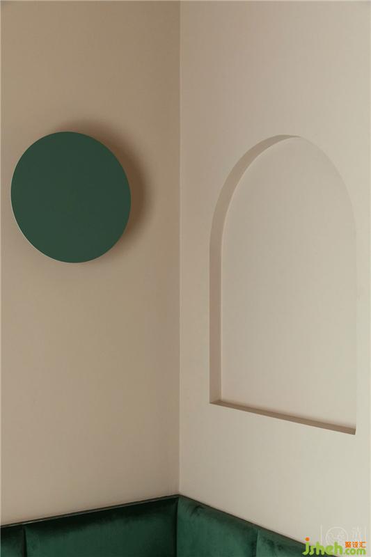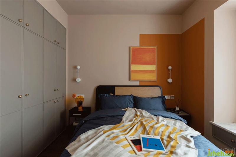 主臥依然多彩,但溫柔了許多,馬蒂斯的溫柔色塊在這里只做部分切割,柔和活力的橙只在轉(zhuǎn)角之間刷了一塊,留白更多,灰綠色的衣柜面板和極具包豪斯美感的黑邊木紋床頭呼應(yīng),營造出臥室舒適、放松的氛圍。