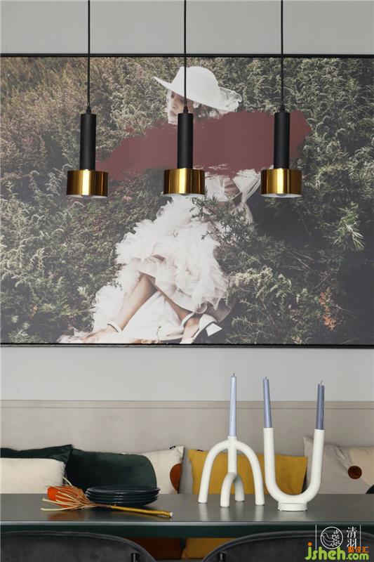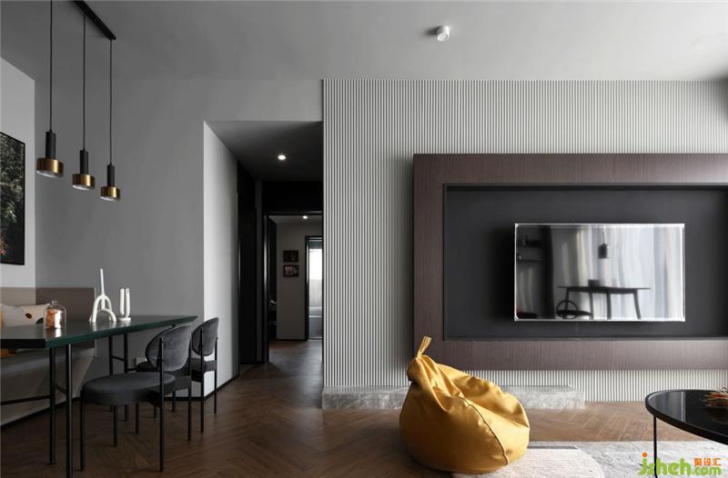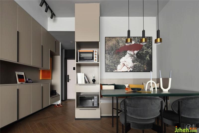 從客廳延伸到餐廳,整體布局呈現(xiàn)一字型,色調(diào)沿用客廳的淺灰色調(diào)為主,局部的暖色作點綴,增加空間層次感。同時考慮到座椅的舒適度,采用不規(guī)則方形的卡座設(shè)計節(jié)約了空間,在卡座下方放腳處增加一個斜度,提升用餐的體驗感。室內(nèi)設(shè)計師