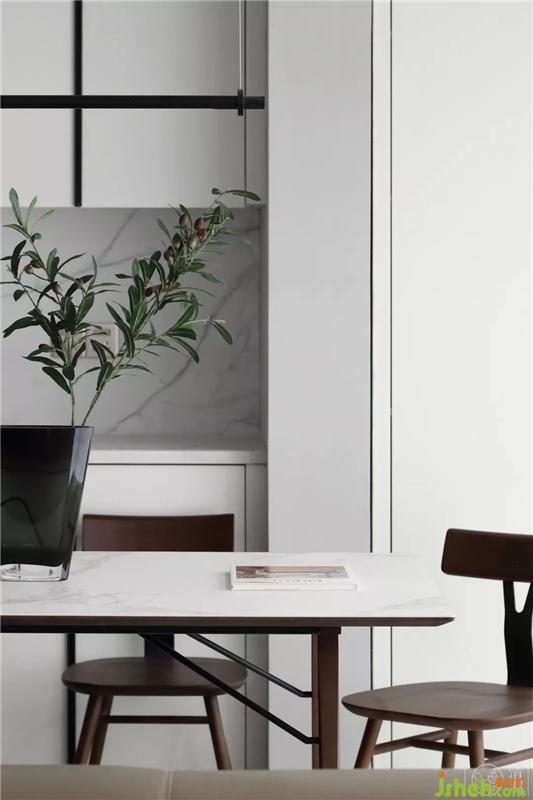 溝通過程中,我們了解到兔子平時(shí)有喜歡烘焙的習(xí)慣,在餐廳西廚區(qū)我們將冰箱嵌入到頂?shù)母吖?,增加了烘焙的操作區(qū),一字型的操作臺。通透開敞的空間里,造型干凈利落的頂面和墻面,搭配室內(nèi)純粹的現(xiàn)代氛圍,體現(xiàn)出兔子現(xiàn)代簡約的生活品質(zhì)感,也滿足了兔子閑暇之余想要制作西點(diǎn)、咖啡、果汁等興趣愛好。