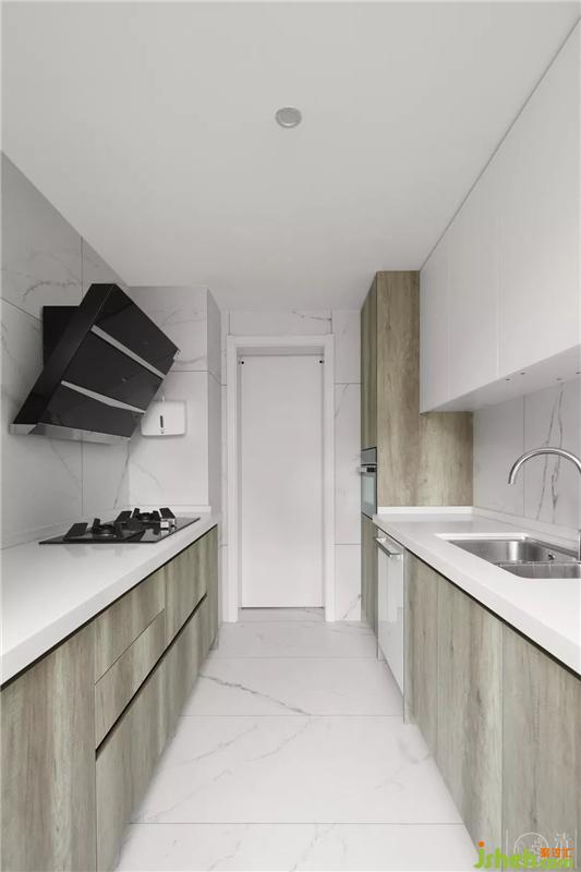 中西文化多種多樣,東方傳統(tǒng)文化與西方現(xiàn)代文化各自獨(dú)立又兼容并蓄。所以在飲食上,考慮到中餐和西餐的做法不一致,廚房的空間有限,我們將中廚區(qū)獨(dú)立設(shè)計(jì),中西廚區(qū)分屬為兩個(gè)陣營,中廚區(qū)繼續(xù)沿用客廳風(fēng)格,整體以白色、木色為主,用黑色拉手、黑色家電點(diǎn)綴其間,彰顯著空間簡單大方的空間氛圍,并且在空間兩側(cè)采用一字型的操作臺,有效的將操作空間進(jìn)行了合理劃分,最大限度增加了廚房的收納空間。