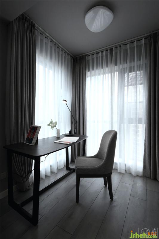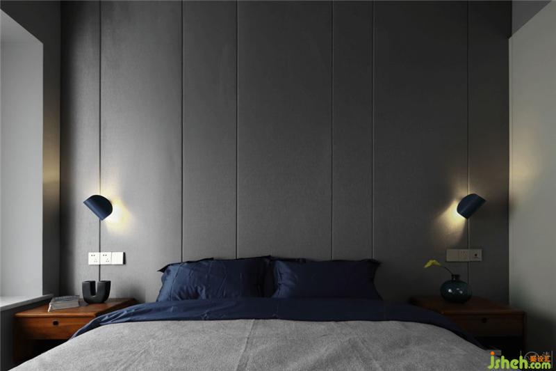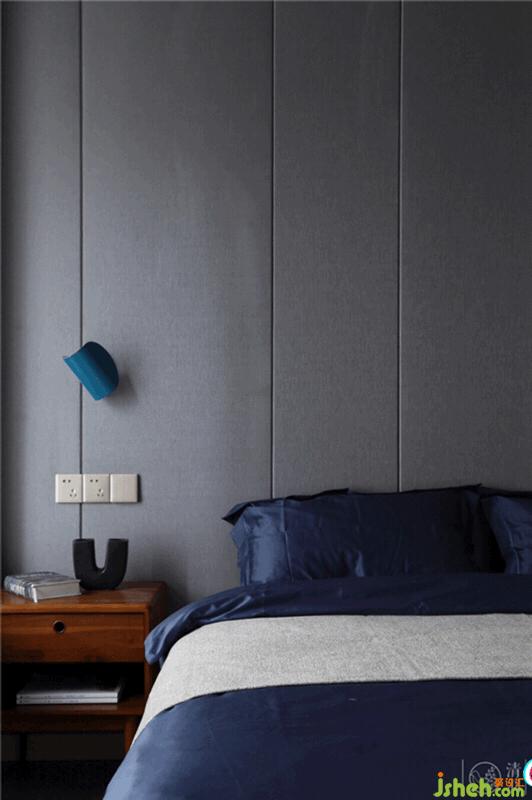 臥室,為了能更好的保證兔子的睡眠質量,我們舍棄了客廳的白色基調,運用了灰色調的墻面,再融合木質地板、灰色窗簾、藍灰色色調的家紡用品、深棕色色調的床頭柜作空間的配色,打破空間里的沉穩(wěn),豐富空間畫面,增加居住舒適度。