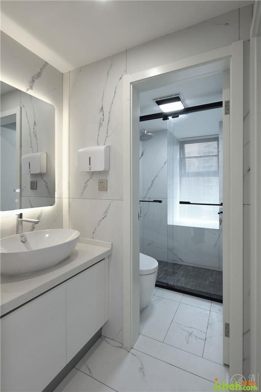 在設計主衛(wèi)時,我們采用透明的到頂?shù)牟AЦ魯鄬⒄w空間分隔出來,達到干濕合理功能分區(qū)的效果,整體形象又不失整潔。用潔凈的墻面、黑白的色調與兔子內心的純潔、高雅相呼應,也為空間增添了趣味性、時尚感以及通透感。呈現(xiàn)出一個獨具現(xiàn)代設計感的空間