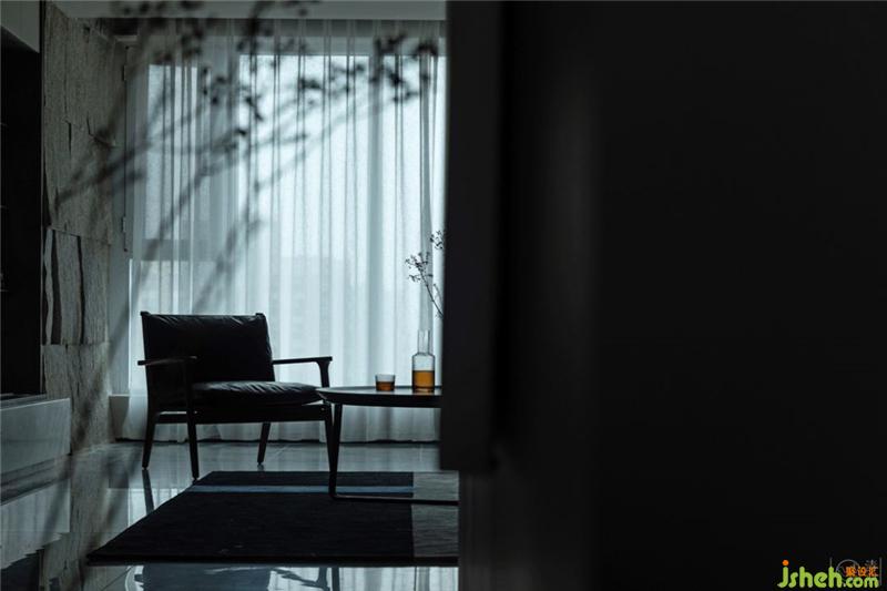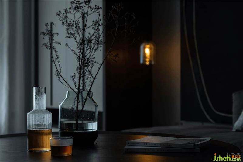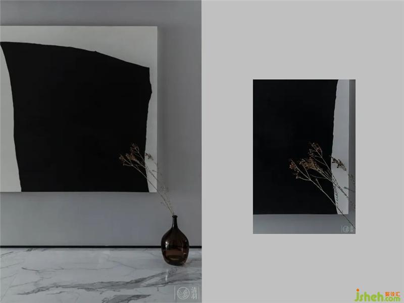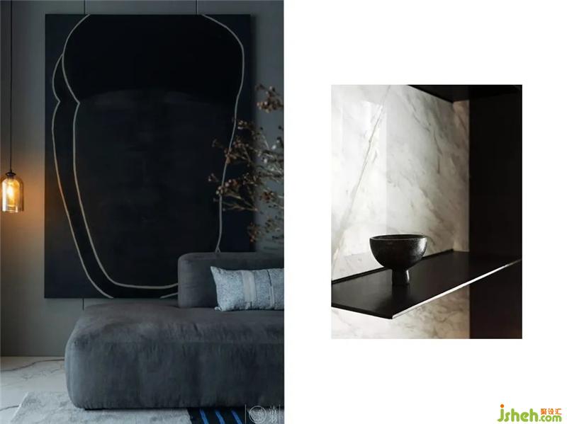 HAY的錫器灰色布藝沙發(fā),黑灰相間點綴的地毯,我們畫好圖然后特地找藝術(shù)家定制的油畫作品,Stellar works咖啡色茶幾和黑色邊幾以及造型沉穩(wěn)大氣的木質(zhì)軟包休閑椅、現(xiàn)代精致工業(yè)風(fēng)的磁吸燈,極簡的壁爐裝飾,幾塊預(yù)先裝入電視背景墻的黑色鋼板……幾乎十指可以數(shù)完的裝飾,恰到好處地豐富了空間的層次感。