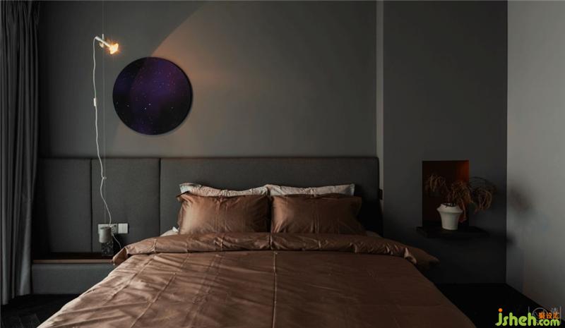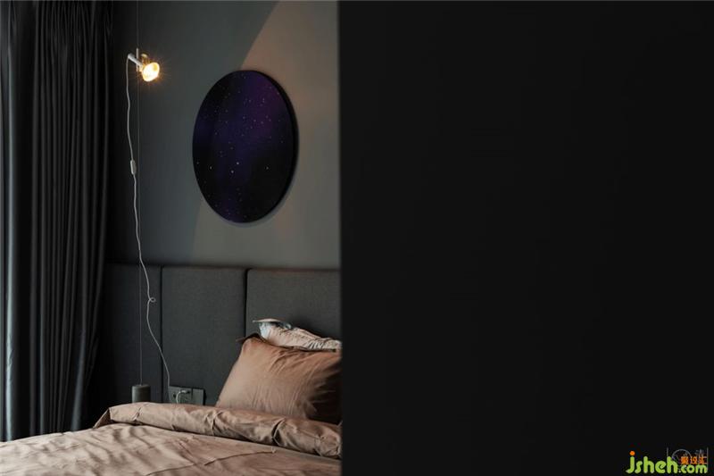 整體定制的床頭與床箱配上德國原裝的WULFF沃福床墊,預(yù)先嵌入墻體的置物板,可以裝飾也可以置物的壁龕,能上下滑動(dòng)、滿足不同生活需求的瑞典Pholc Blend混凝土Led吊燈,以及一塊星空藝術(shù)裝置,一張柔軟的白色地毯,就是為數(shù)不多的裝飾了。