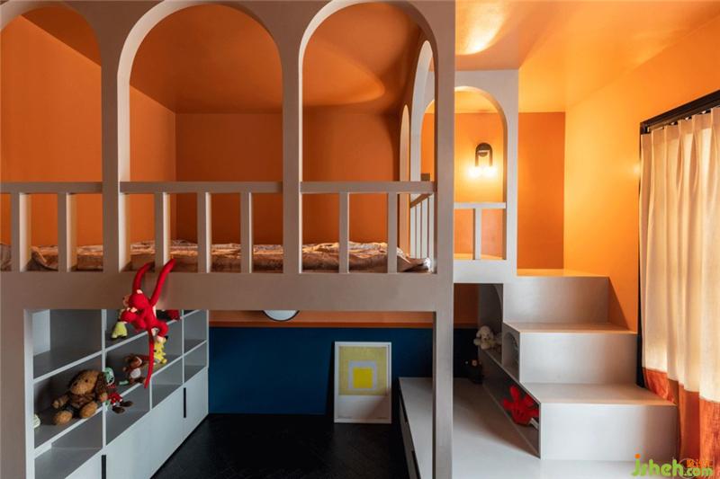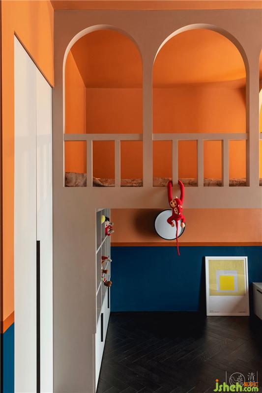 女兒房以橙藍(lán)對(duì)比色營造出空間輕松明快的氛圍,迷你的拱門圍繞成床的圍欄,又帶出一點(diǎn)騎士堡既視感,希望小姐姐能在這里成長成一位勇敢的“公主”。