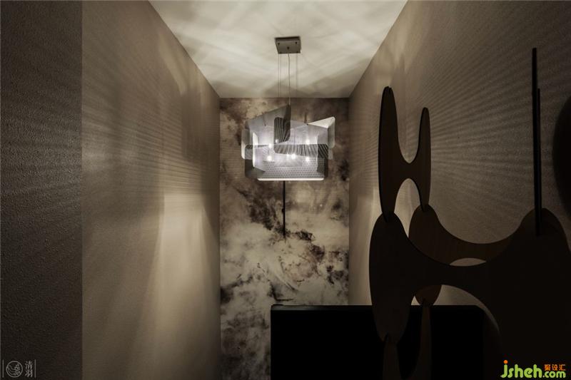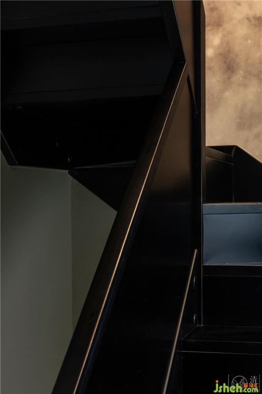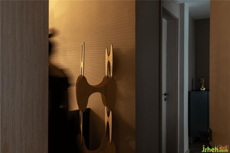 由于是復(fù)式結(jié)構(gòu),連接兩層樓的樓梯相對(duì)不會(huì)太寬太長(zhǎng)。我們結(jié)合TBS木質(zhì)樓梯簡(jiǎn)單利落的線條,用燈與藝術(shù)裝置產(chǎn)生的光影效果制造出空間交錯(cuò)感,來(lái)弱化較狹窄空間可能會(huì)產(chǎn)生的壓迫感。而在這樣的光影下,Nebulae的Italy Wall & Deco 墻紙讓樓梯間的墻面好似時(shí)空隧道的入口……