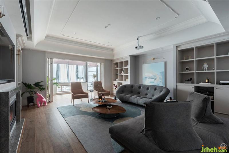 客廳的全套家具都來(lái)自Ligne Roset寫意空間,灰色網(wǎng)面布沙發(fā)是Ploum系列,極具曲線感,就像海浪,為平靜的海洋增添一絲韻律十足的趣味感。