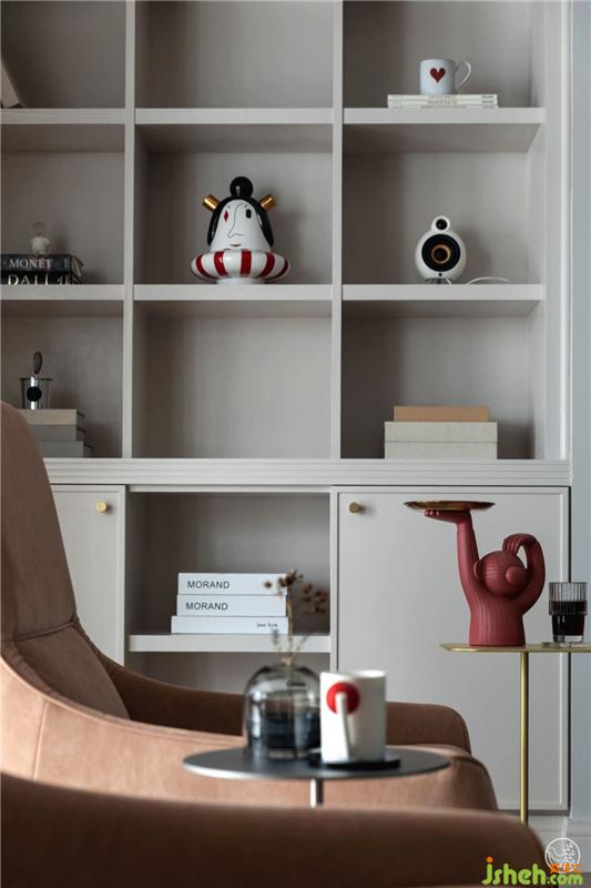 沙發(fā)背景墻的奶油白收納展示柜是現(xiàn)場(chǎng)制作的,大氣簡(jiǎn)潔。青年藝術(shù)家楊家勇的原創(chuàng)油畫,色彩淡雅,線條柔和而抽象,更添一絲寧?kù)o雅致。室內(nèi)設(shè)計(jì)師