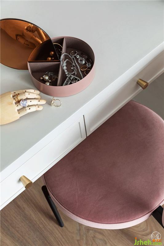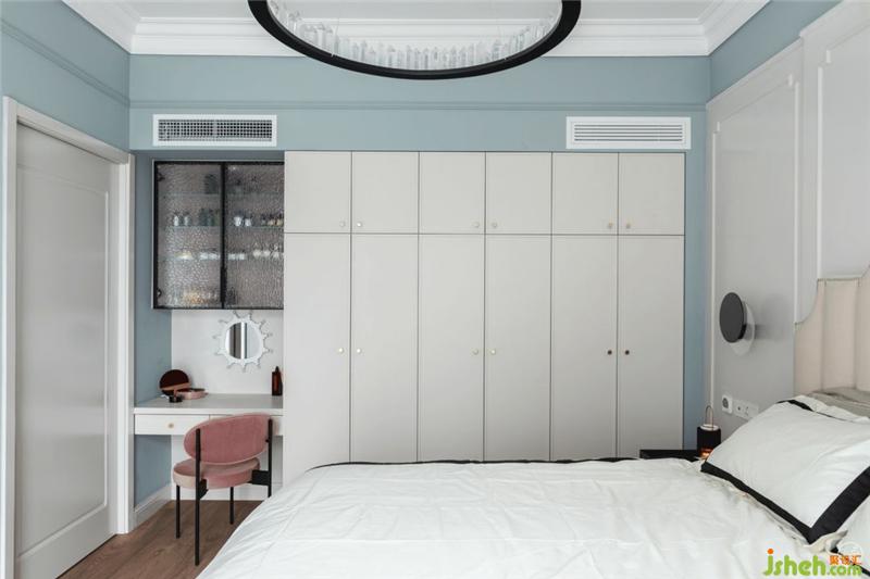主臥的衣柜是現(xiàn)場(chǎng)定制的,和背景墻的色彩一致,都是質(zhì)感十足的奶油白,收納功能很強(qiáng)大。這一次,有別于將整面墻做成隱形收納柜的常規(guī)操作,我們?cè)谂赃吙桃忾_(kāi)辟出了一隅特別的梳妝區(qū),只要打開(kāi)那兩扇黑色金屬框鑲水波紋玻璃的柜門(mén),你就能窺見(jiàn)女主人的“快樂(lè)宇宙”。