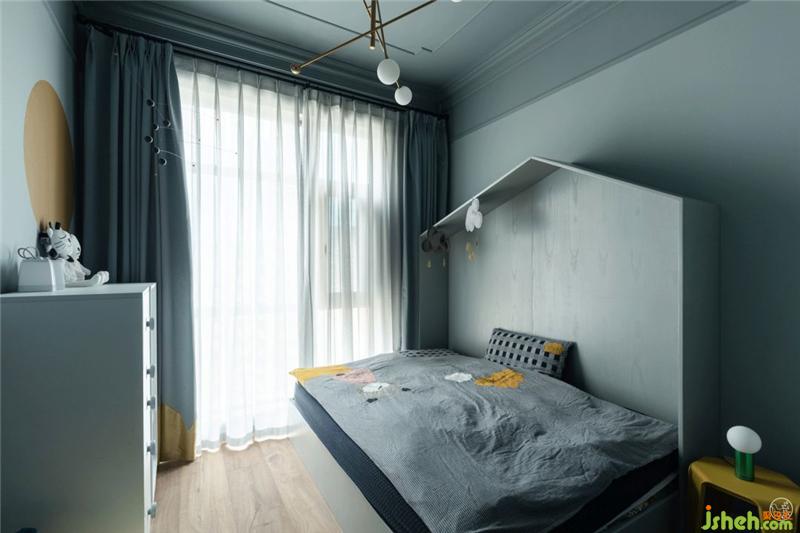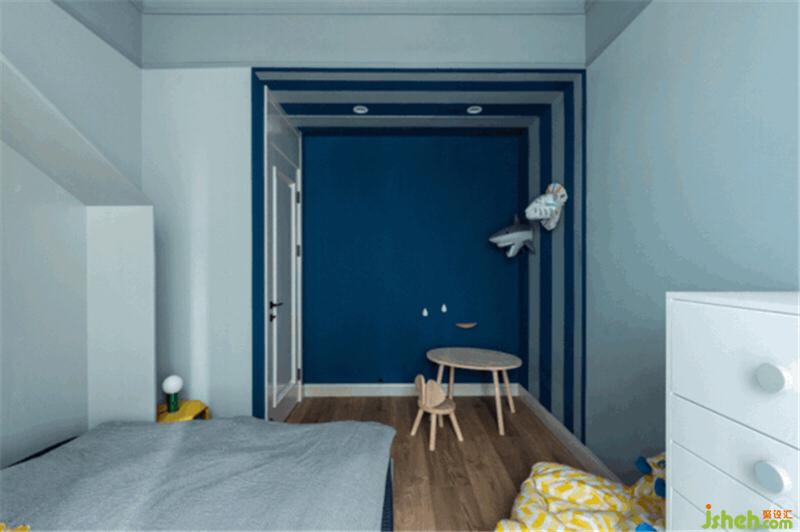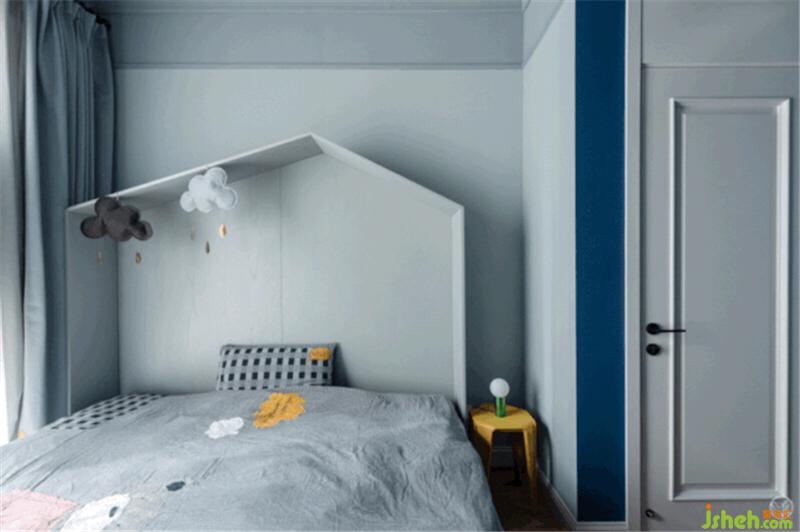 小男孩的房間像這個海洋般浪漫的家中的一座小島,奇趣而明快,基調依然是淺灰藍,頂面的藍又比墻面的藍稍深一度,窗簾的藍又比頂面深一度,小床房頂造型可愛又能讓孩子入睡時更有安全感。