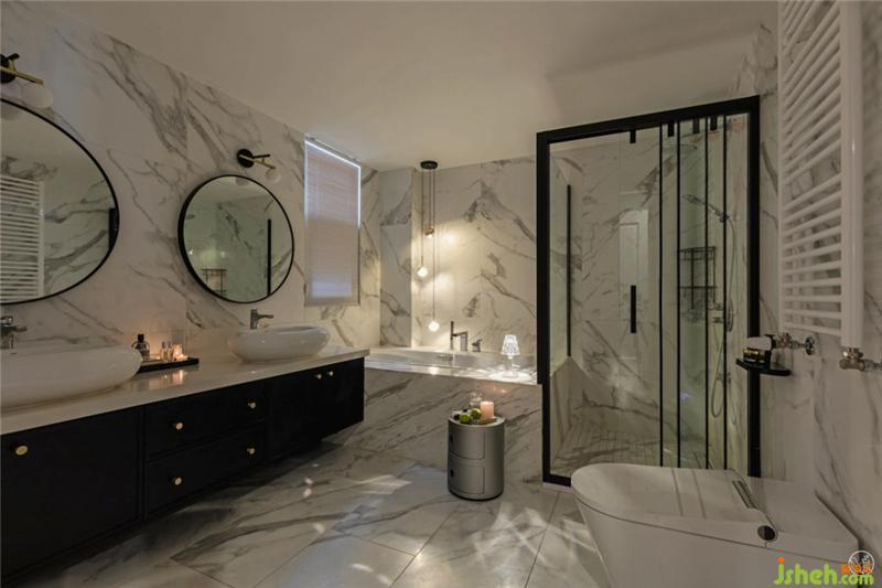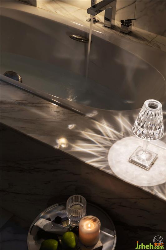 主衛(wèi)是潔凈夢幻的卷云,墻面地面都是水墨般流動的大理石紋,極具輕柔的整體感。浴缸墻角的圓形吊燈就像流星劃落,小巧復古的全水晶臺燈,點上香薰燭,陷入水的柔情和溫暖中,迎來一天最放松的時刻。室內(nèi)設(shè)計師