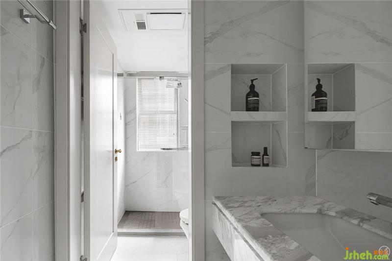 在淋浴間,我們采用粉色石材的地面,視覺上拉伸狹小的空間,浪漫的空間氛圍并帶有優(yōu)雅、高級質感的空間躍然而出。室內設計師