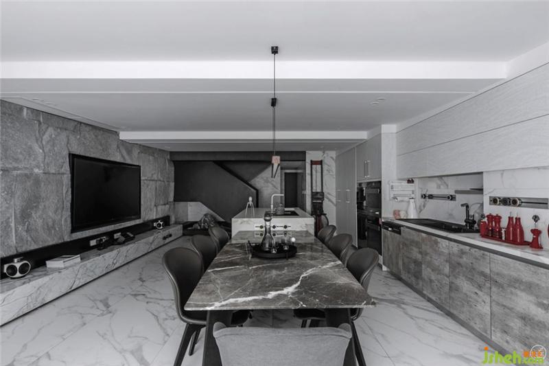 而線條柔和的BoConcept黑色餐椅則中和了石材帶來(lái)的硬朗感。